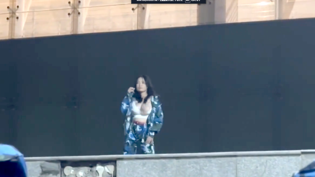 野外ぽいステージ上でダンスする巨乳女性のハプニング。